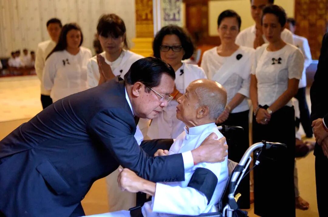1998年拉那烈亲王获准回到柬埔寨之后,因遭遇车祸不良于行。图为2019年11月,洪哥在王室葬礼上拥抱安抚昔日对手、如今一败涂地坐龙椅的拉那烈。