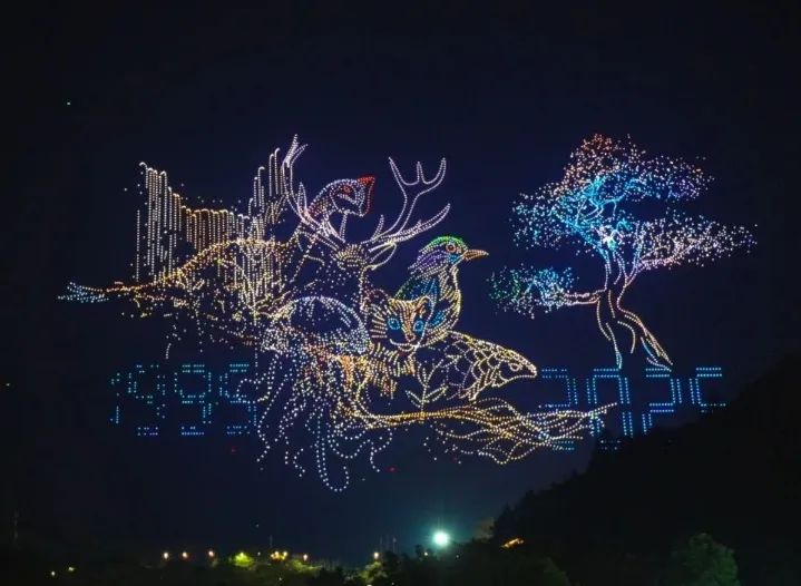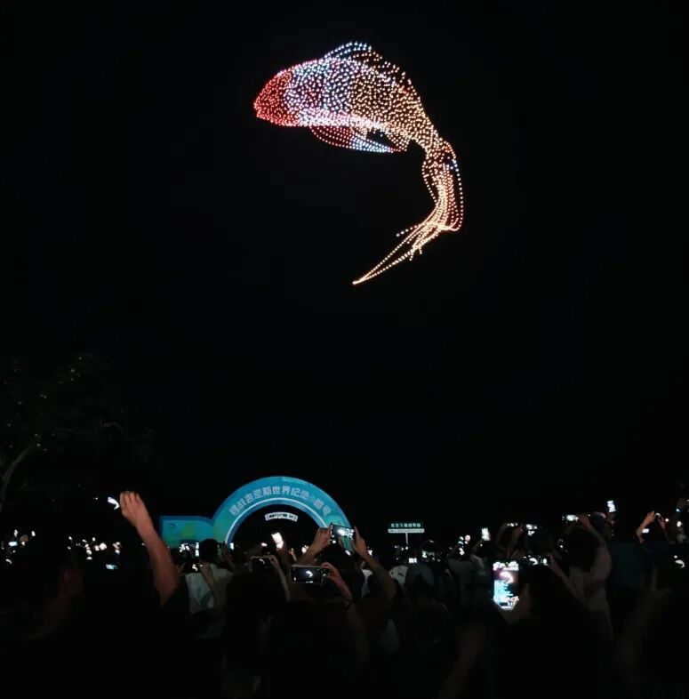 这场空中光影盛宴由六大主题画面串联而成。分别为“鱼跃龙门·开湖献礼”“厨王争霸·鲜鱼幻宴”“生态长卷·青山绿水30年”“碧波生花·花神巡游”“星河织锦·龙凤贺寿”“未来之窗·科技生态共生”。开篇的 “鱼跃龙门·开湖献礼”中,灵动的鱼群造型从湖面跃向天际,与“天上瑶池水,人间万绿湖”的金句流转。“厨王争霸·鲜鱼幻宴” 则用光影勾勒出沸腾的汤锅与舞动的食材,烈焰中升腾“鲜”字的光印。“生态长卷·青山绿水30年”堪称全场焦点,粒子组成的卷轴缓缓展开,从1995年到2025年,大坝、水流、珍稀动物等元素生动呈现万绿湖生态保护成果,30年生态保护的坚实足迹清晰可见。随后的“碧波生花·花神巡游”中,梅花、荷花等花卉造型次第绽放。“星河织锦·龙凤贺寿”篇章中,三丈仙桃、金龙、朱凰环飞等图案,被无人机群勾勒得栩栩如生,引来阵阵喝彩。最终的“未来之窗·科技生态共生”篇章中,无人机群化作桃花水母、“天眼”与科技之树,“自然无界·心归同栖”的字样缓缓浮现,传递科技与自然和谐共生的深远思考。