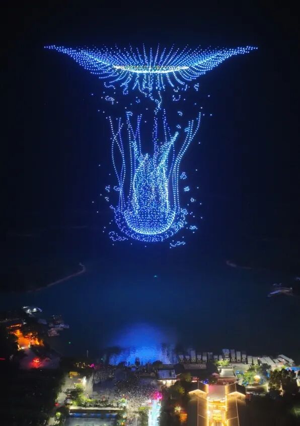 当晚,随着指令下达,万架无人机从万绿湖岸边有序升空,瞬间化作夜空中的点点星光。编队在精准操控下不断变换造型,在夜空中迅速移动、变换阵型,每一个动作都精准得如同钟表齿轮的咬合。