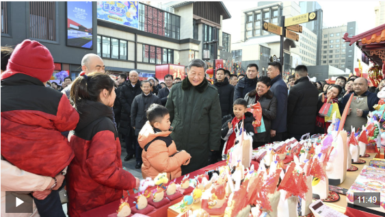 总书记察看街区风貌和各式年货摊位,同现场群众亲切交流。他愉快地向大家讲起年少时多次到隆福寺的情景,还购买了特色食品和文创产品。