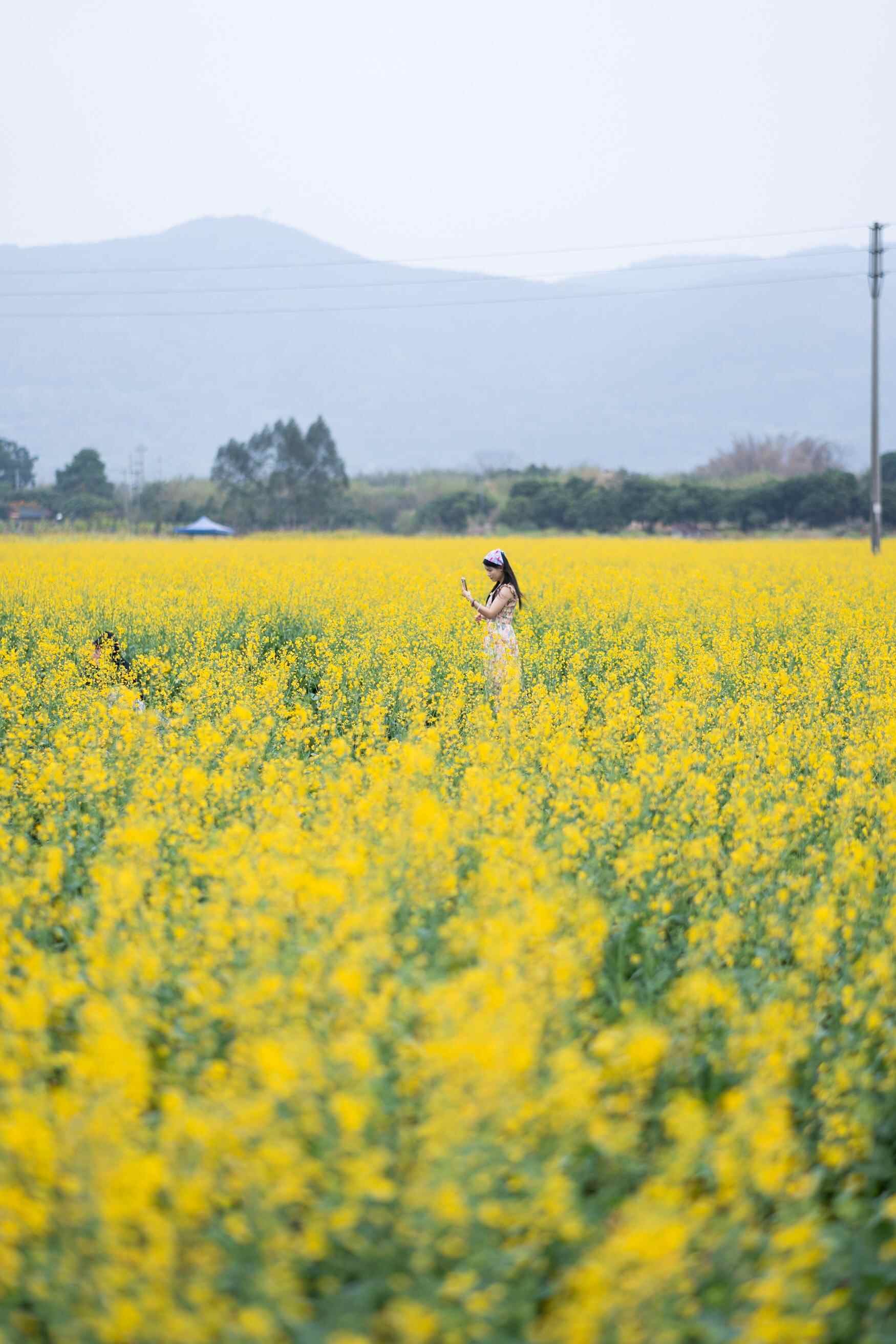 走在乡间的小径上,空气中弥漫着油菜花特有的清新香气,仿佛能洗净心灵的尘埃。那400亩的油菜花田,如同金色的波浪,随风起伏,与蓝天白云、绿水青山交织成一幅幅动人的田园诗篇。多个“粤油”系列的品种铺开五彩缤纷的不同色块,更是为这片花海增添了丰富的层次感,每一朵油菜花都饱满而鲜亮,在微风中轻摇,向世界宣告着春天的到来。