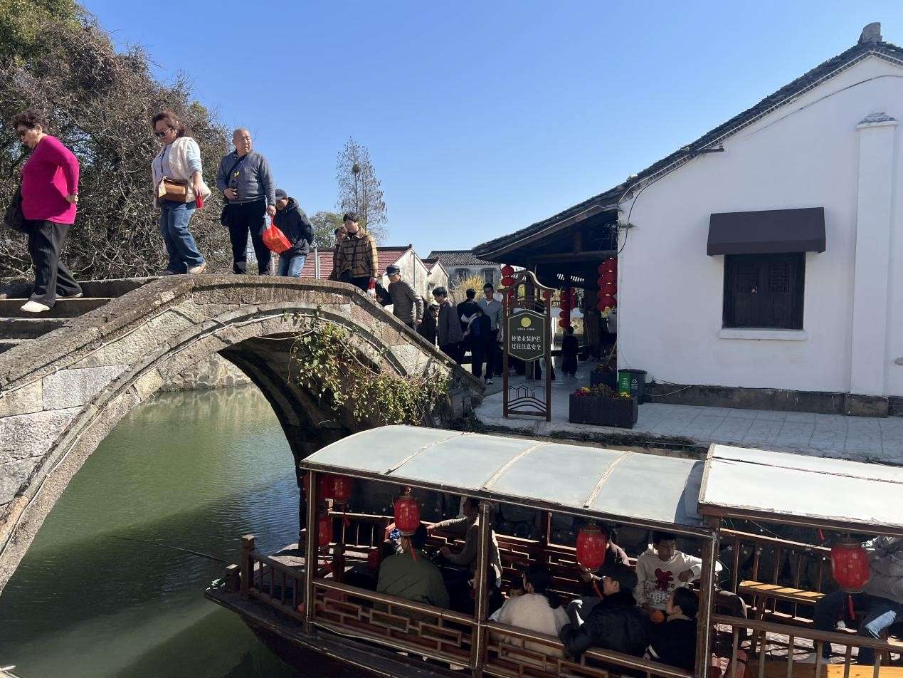 泛舟水上,共庆新年。游客乘花船穿行于古桥碧波之间,感受水墨江南的独特韵味。两岸灯笼高挂,倒映水中,宛如流动的年画,成为家庭休闲和情侣浪漫体验的热门选择。