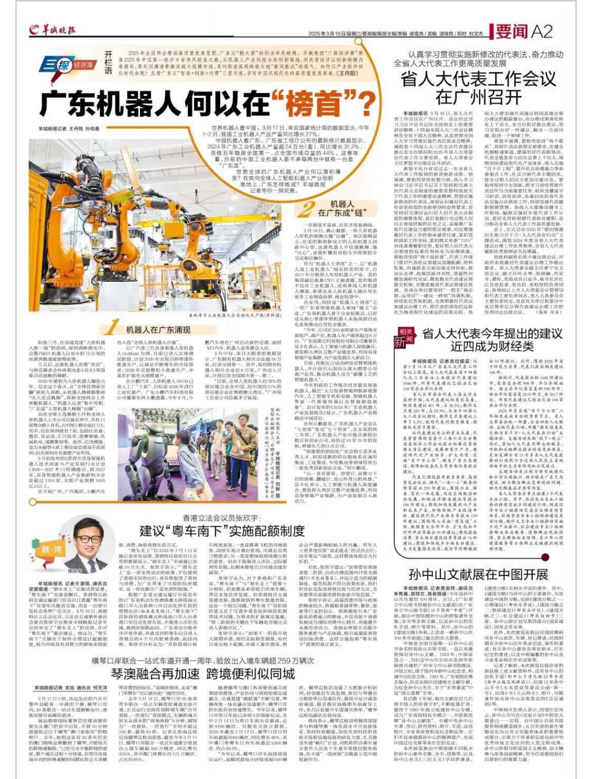 2025年全国两会擘画高质量发展蓝图,广东以“挑大梁”的担当率先破题。羊城晚报“三探经济策”聚焦2025年中国第一经济大省乘风破浪之路,从机器人产业剑指全球创新高地,到民营经济以创新破解内卷困局,再到国潮消费激活超大规模市场,系列报道展现岭南大地“敢闯敢试”的锐气。如何以产业跃升回应时代命题?且看广东以“智造+创新+内需”三箭齐发,书写中国式现代化的高质量发展答卷。(王丹阳)