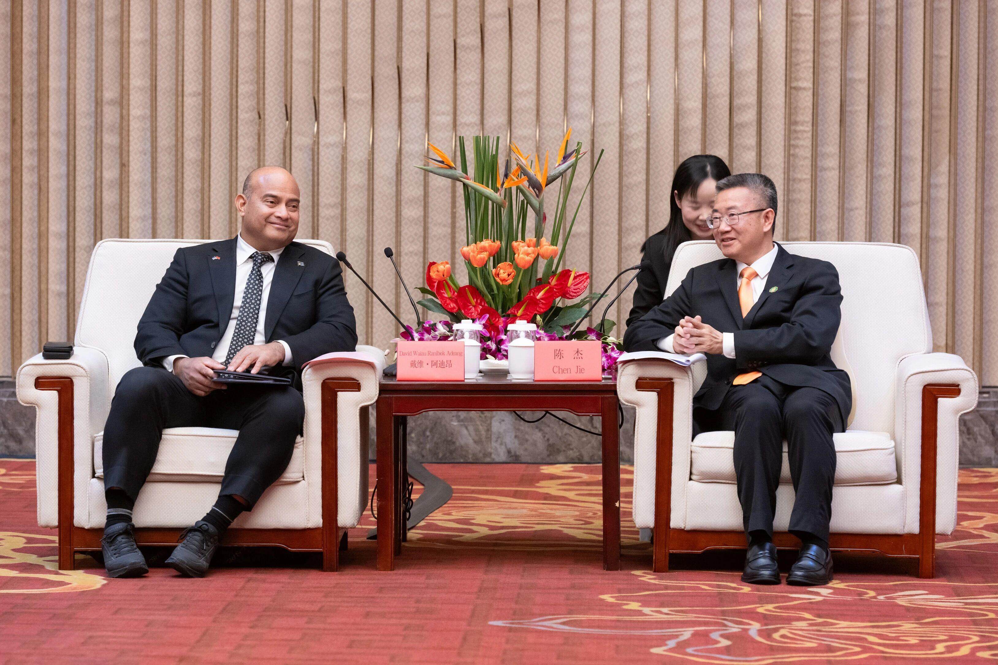 10日中午,陈杰与阿迪昂总统会面交流。陈杰代表江门市委、市人大、市政府、市政协,代表江门全市人民、海外乡亲,向阿迪昂总统一行表示热烈欢迎,并简要介绍了江门经济社会发展情况。他说,习近平主席高度重视中瑙关系发展,在习近平主席与总统阁下的战略引领下,两国全方位开展各领域务实合作,共建中国—太平洋岛国命运共同体,书写了南南合作的动人篇章。去年7月,总统阁下荣归故里、寻根谒祖,家乡人民欢欣鼓舞。一年来,江门坚决贯彻落实习近平主席与总统阁下达成的一系列重要共识,在省委书记黄坤明的关心指导下,形成了实实在在的合作成果。此次总统阁下在中国传统佳节“小年”回乡探亲,对于拉紧亲情纽带、促进人民友谊、深化双方合作,有着十分重要的意义。我们期待以此次相聚为契机,进一步促进对接交流,加强渔业捕捞、渔业深加工、生态环保、光伏新能源等产业合作,做深“小而美”项目,深化文化、教育、体育等民间互动交流,更好增进双方情感联结、造福当地人民,让这份跨国亲情愈发浓厚绵长。
