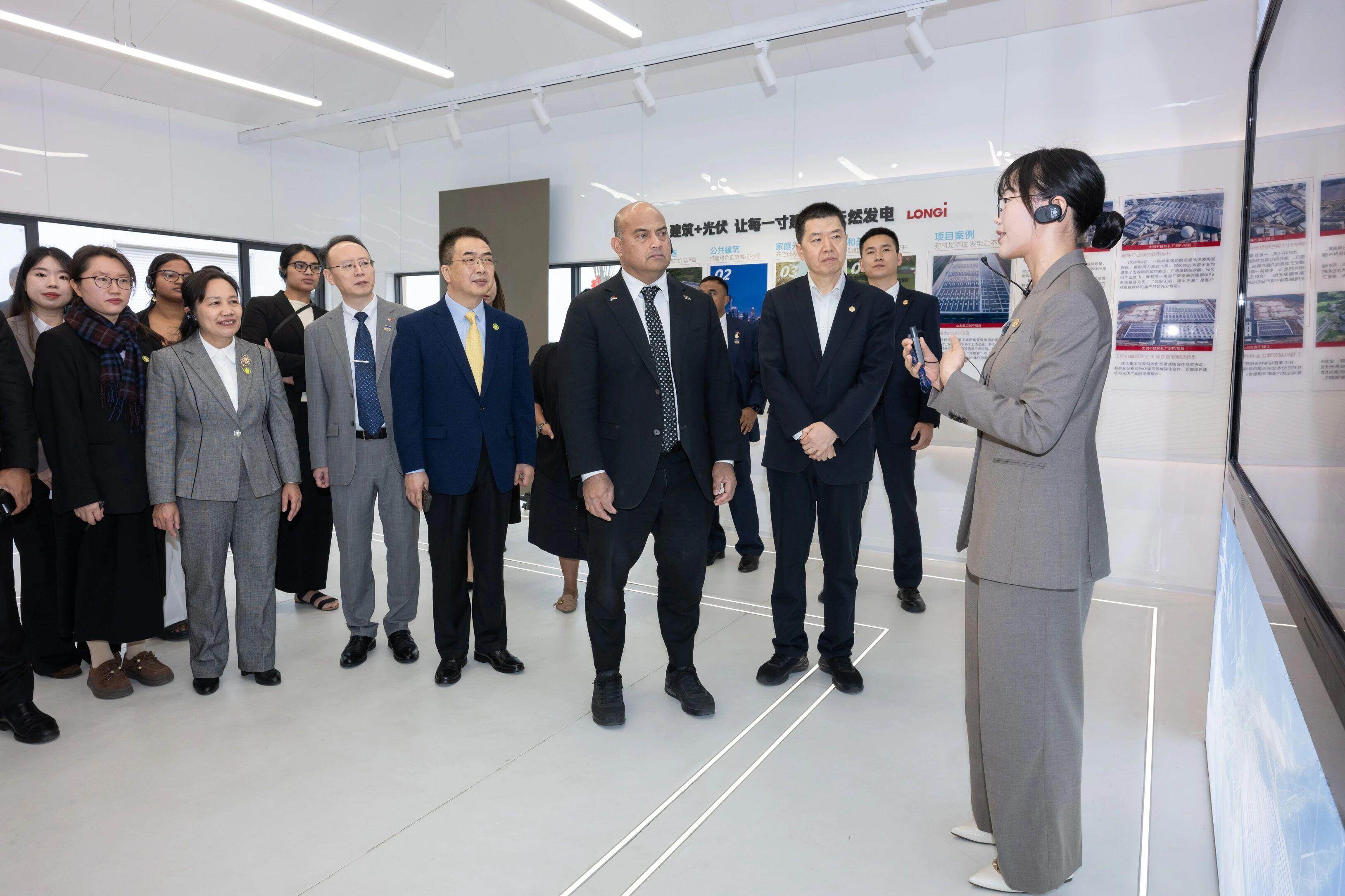 隆基绿能生产的硅片和光伏组件出货量排名全球前列,其鹤山项目规划总投资达100亿元,建成后将成为全省乃至全国排名前列的光伏组件等产品生产和出口基地。阿迪昂总统一行参观光伏建筑一体化展示区、光伏小屋体验馆、屋顶电站等地,详细了解光伏建材产品应用推广情况。他充分肯定了项目的创新性,认为对太阳能的利用使能源实现可再生化,并相信类似项目或技术能够帮到其他国家。“目前瑙鲁的可再生能源占比达到50%,主要依靠小型太阳能发电设施,但相信通过两国之间的合作,可以在很短的时间内将这一比例提升至100%,并成为其他国家在中方支持下取得成果的榜样。”阿迪昂总统说。