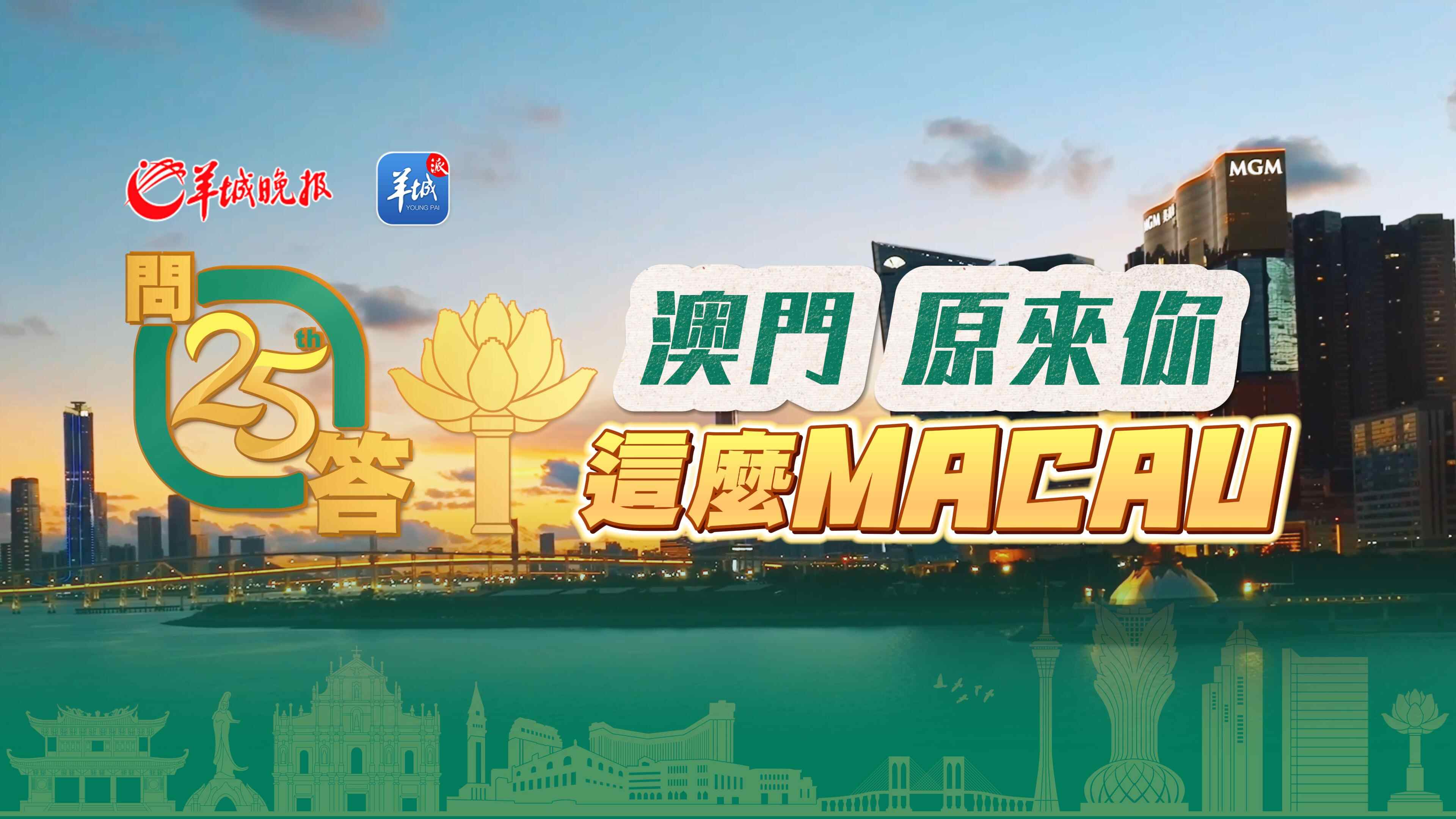 羊城晚报特别策划“25周年·25问答”系列,几个月来,征集了各地网友关注关心澳门的热点话题,邀请澳门本土各界人士一一作答,从11月中旬以来,已持续推出九期人物访谈。其中,不仅有澳门特区政府文化局、旅游局、体育局、药物监督管理局、劳工事务局、教育及青年发展局等部门负责人亲自解惑,还有澳门城市文化促进会、澳门中药业公会等社团领袖从各自专业领域推介澳门,更有深受年轻群体欢迎的新生代本土音乐组合,用原创音乐为澳门回归祖国25周年打CALL……今日(20日)恰逢澳门回归祖国25周年庆典,特别推出第十期,将来自澳门社会各界的热情回答制作成上、下两辑《澳门,原来你这么MACAU》,希望通过轻松活泼的“澳门问答”,让大家更加立体直观地走近澳门,了解澳门,发现澳门之美。请戳开视频观看更精彩——