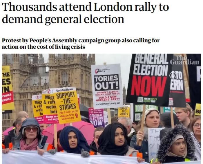 伦敦市中心爆发抗议,数千人冒雨集会要求提前举行大选。其中一名抗议者在接受采访时直言:“我们想摆脱苏纳克。我们想让保守党下台——这是实现改变的唯一途径。”