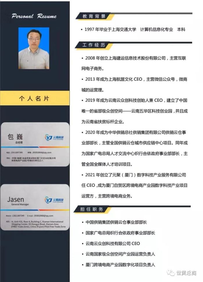 包巍先生,1997 年畢業於上海交通大學 計算機信息化專業本科 . 任職中國供銷集團供銷雲倉事業部部長 • 國家廣電總局織行合依政府事業部部長 • 雲南雲眾創科技有限公司 CEO • 雲南國家級眾創空間產業園運營負責人 • 廈門跨境電商產業園數字化項目負責人 •2008 年創立上海建運信息技術股份有限公司,主營互聯 網電子商務。• 2013 年成為上海航盟文化 CEO,主營微信公眾號,微商 城的運營理。2019 年成為雲南雲眾創科技創始人兼 CEO,建立了中國 唯一的省部級眾創空間——雲南五華區科技創業園,並且成 為雲南省扶貧標杆企業。2020 年成為中華供銷總社供銷集團有限公司供銷雲倉事 業部部長,主管全國供銷雲倉城市供應鏈中心項目。同年成 為國家廣電總局人才交流中心織行合依政府事業部部長,主 管全國全媒體人才培訓項目.