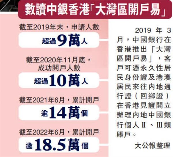 中銀於2019年開設了大灣區「開戶易」服務,讓港人即使不能親身前往內地,亦可開立內地銀行戶口。中銀香港個人金融及財富管理部副總經理劉賽麗表示,今年2月大灣區開戶易的日均開戶量亦較上個月上升近四成,基本已回復疫情前水平,而截至2月11日,當月查詢量更是1月的兩倍。