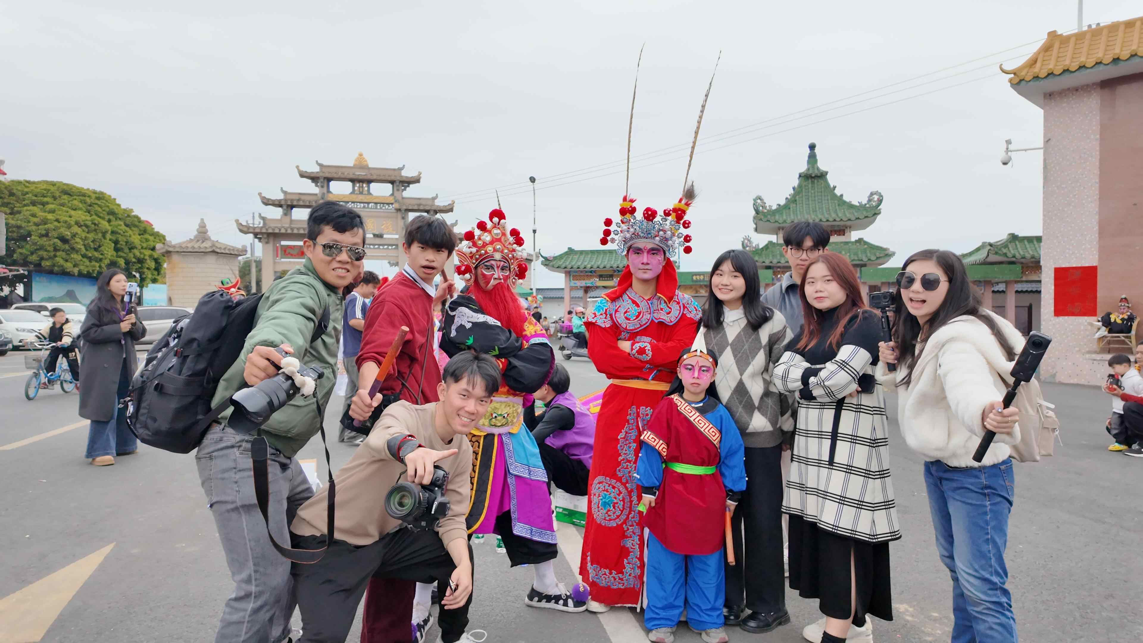 参访揭阳三山国王祖庙的时候,揭阳东园青年英歌队惊喜亮相,刚柔并济、热情奔放的舞姿吸引交流团一路追随拍照。大部分台湾年轻人都是首次现场欣赏英歌舞表演,过后纷纷化身粉丝,踊跃向队员请教招式。