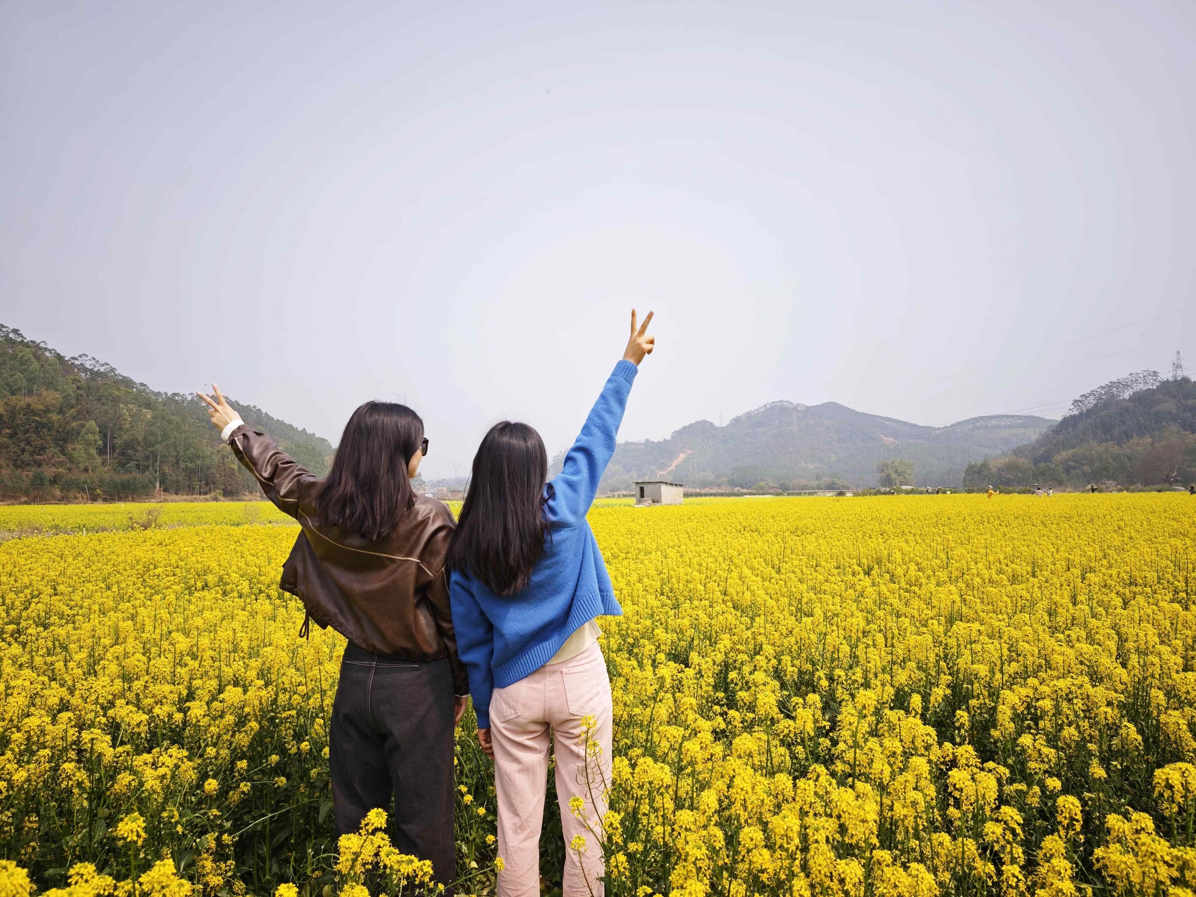 不少游客结伴而来,她们在花海中欢笑、拍照,留下与春天的浪漫合影。