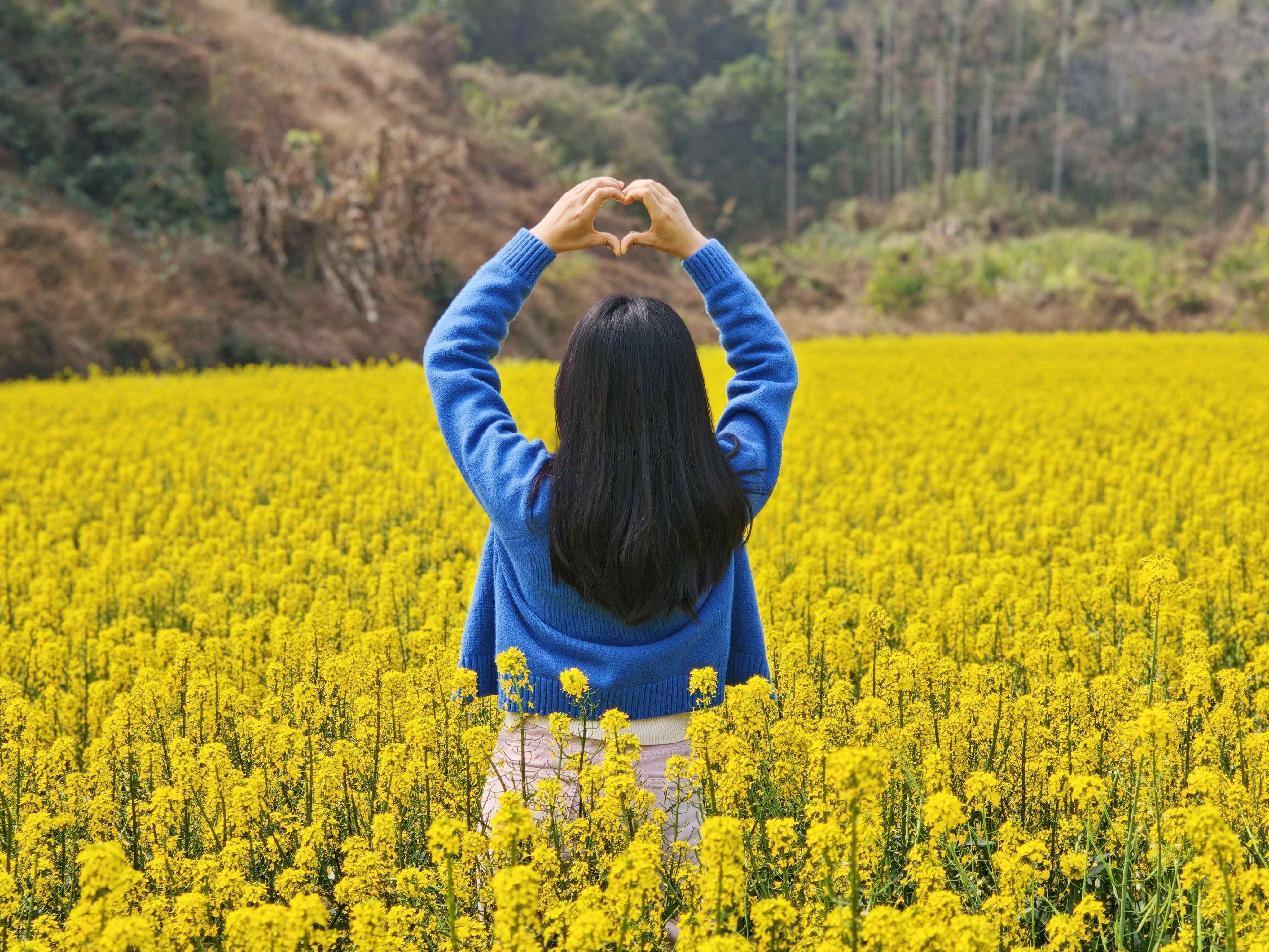 还有游客置身花海,双手比心,尽情享受着这美好的时光。