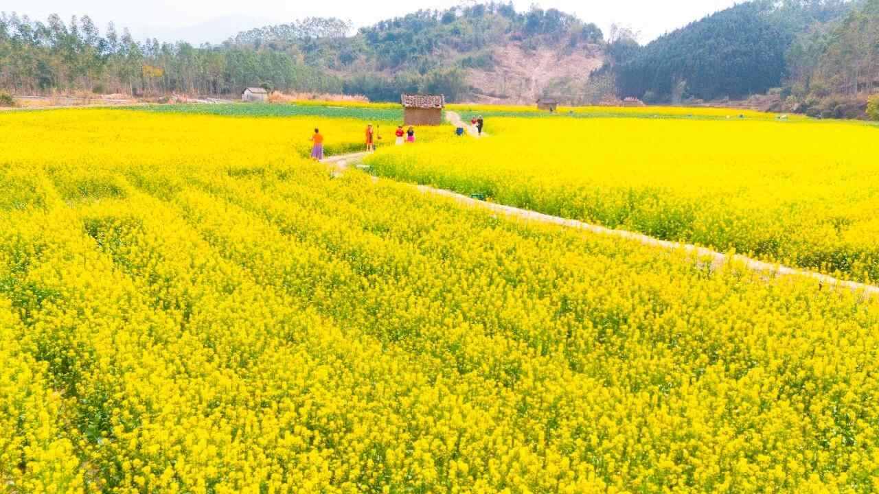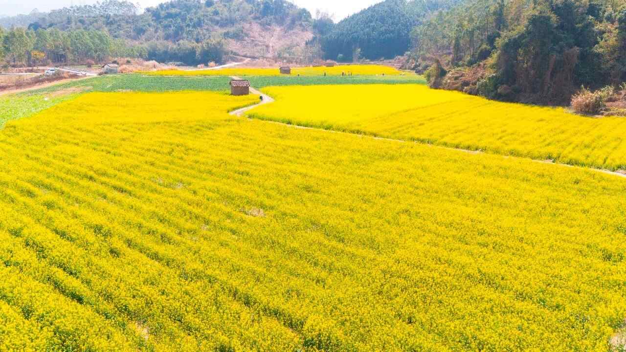 极目远眺,连绵的青山与金黄的花海相互映衬,构成了一幅绝美的田园风光图。