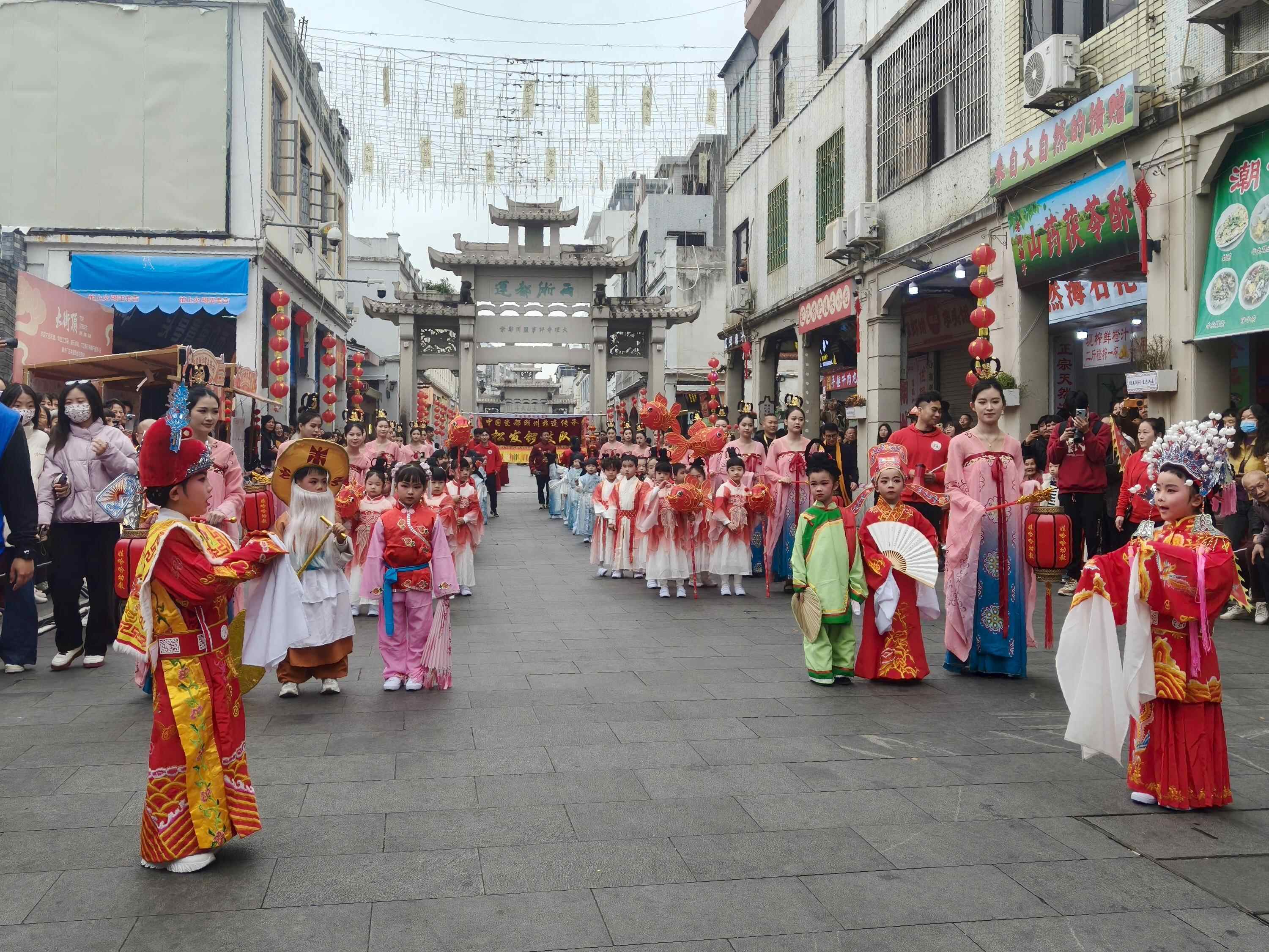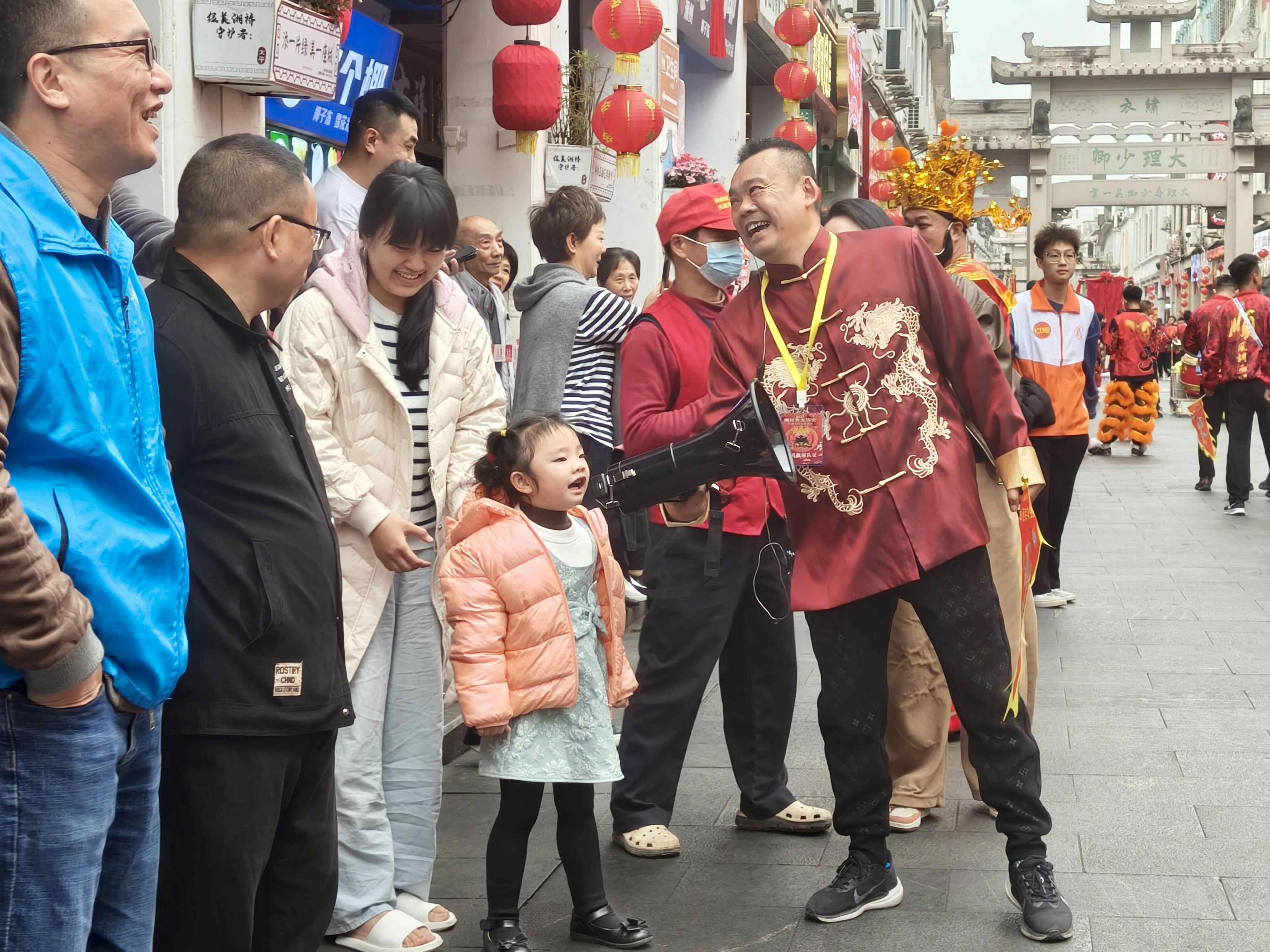 上午八时,随着三声炮响,装扮一新的彩车缓缓从青龙古庙开出,巡游正式开始。标旗、舞龙、锣鼓、花灯、英歌舞……各个方阵队伍如流水般有序跟进,表演人员脸上洋溢着热情的笑容,以最热烈的情绪共同参与活动。